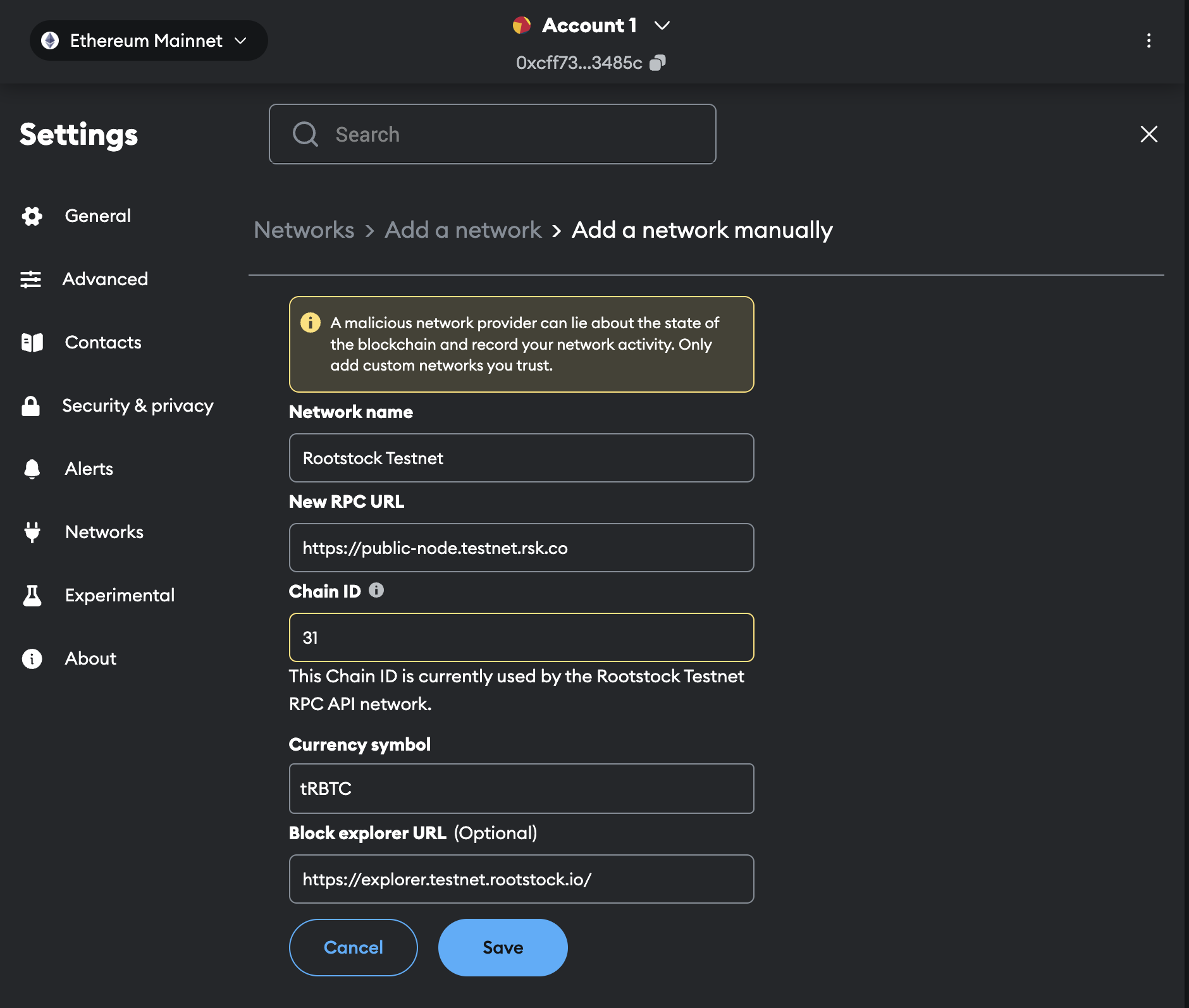 Fill the required fields to add Rootstock Mainnet or Testnet with the network settings from the table below: