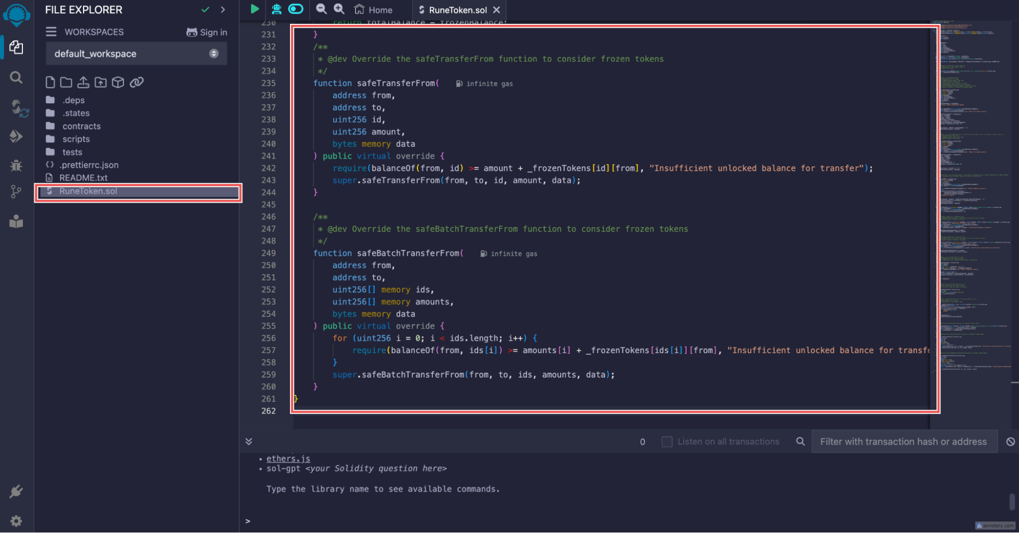 2. Paste the copied code into the newly created RuneToken.sol file in Remix IDE.